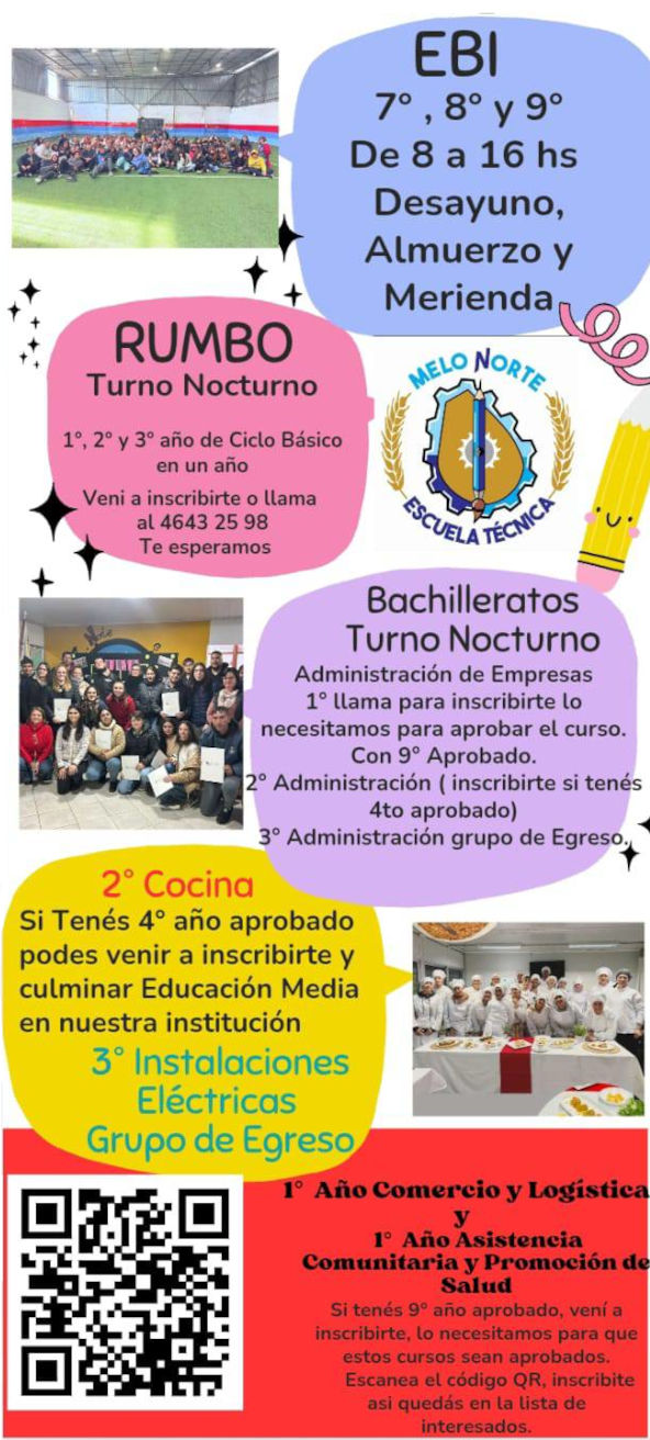 La Escuela Técnica Melo Norte ya trabaja en la planificación de su oferta educativa para el año lectivo 2026, incorporando nuevas carreras y modalidades para atender la demanda de estudiantes y la comunidad. Entre las principales innovaciones se destacan las carreras de Comercio, Logística, Asistencia y Promoción de la Salud.