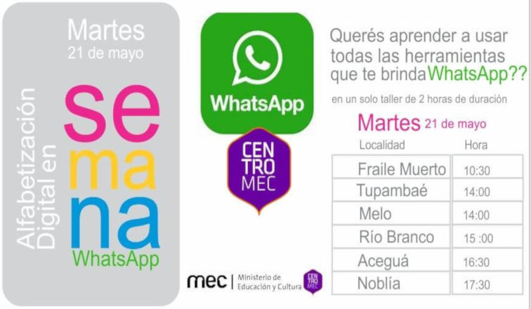 El próximo martes 21 se va estar desarrollando una actividad sobre Alfabetización Digital, más precisamente un taller sobre el uso de Whatsapp en todos los Centros MEC del departamento: “toda una información necesaria para poder usar esta aplicación y lo vamos a estar haciendo en simultáneo en todos los centros MEC”, sentenció.